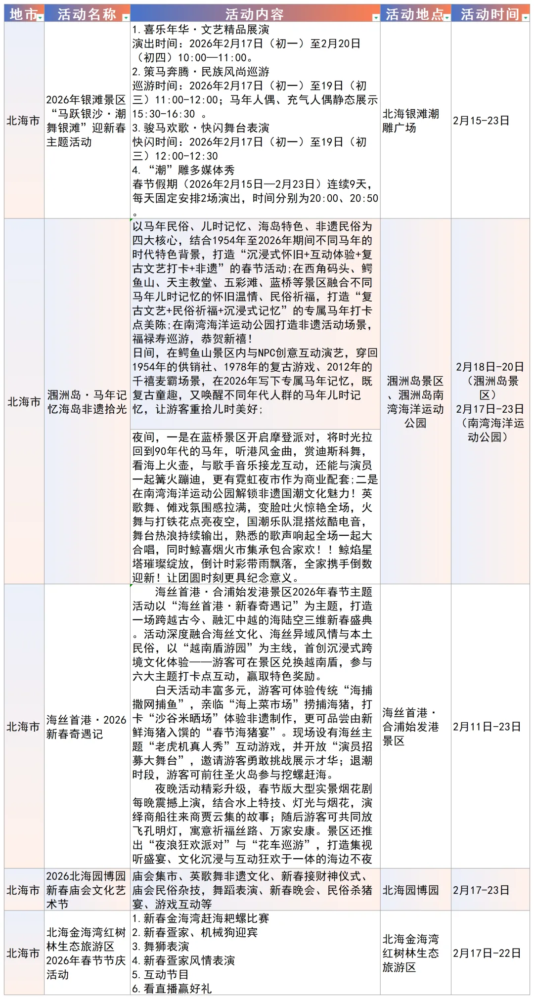 近期,文旅君陆续推出各地新春文旅活动安排,本期选取了北海市、防城港市、钦州市、贵港市、玉林市的重点文旅活动预告,带你感受广西魅力,开启新春欢乐之旅。第一期内容可点击此链接查看→春节来临之际,广西各地推出系列文旅活动① | 南宁、柳州、桂林、梧州