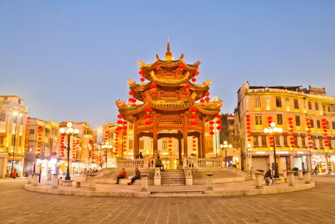从汕头小公园亭为中心散开的网状骑楼街道,像这座城市百年商业历史的年轮。夜晚潮人码头的光带在黑色海面上画出流畅曲线,隔岸楼宇灯光倒映水中,景象交织如同海市蜃楼。远眺杨枝寺的观音像,那静默的剪影仿佛介于过去与永恒之间,为这座城市树立了一座看得见的精神航标。