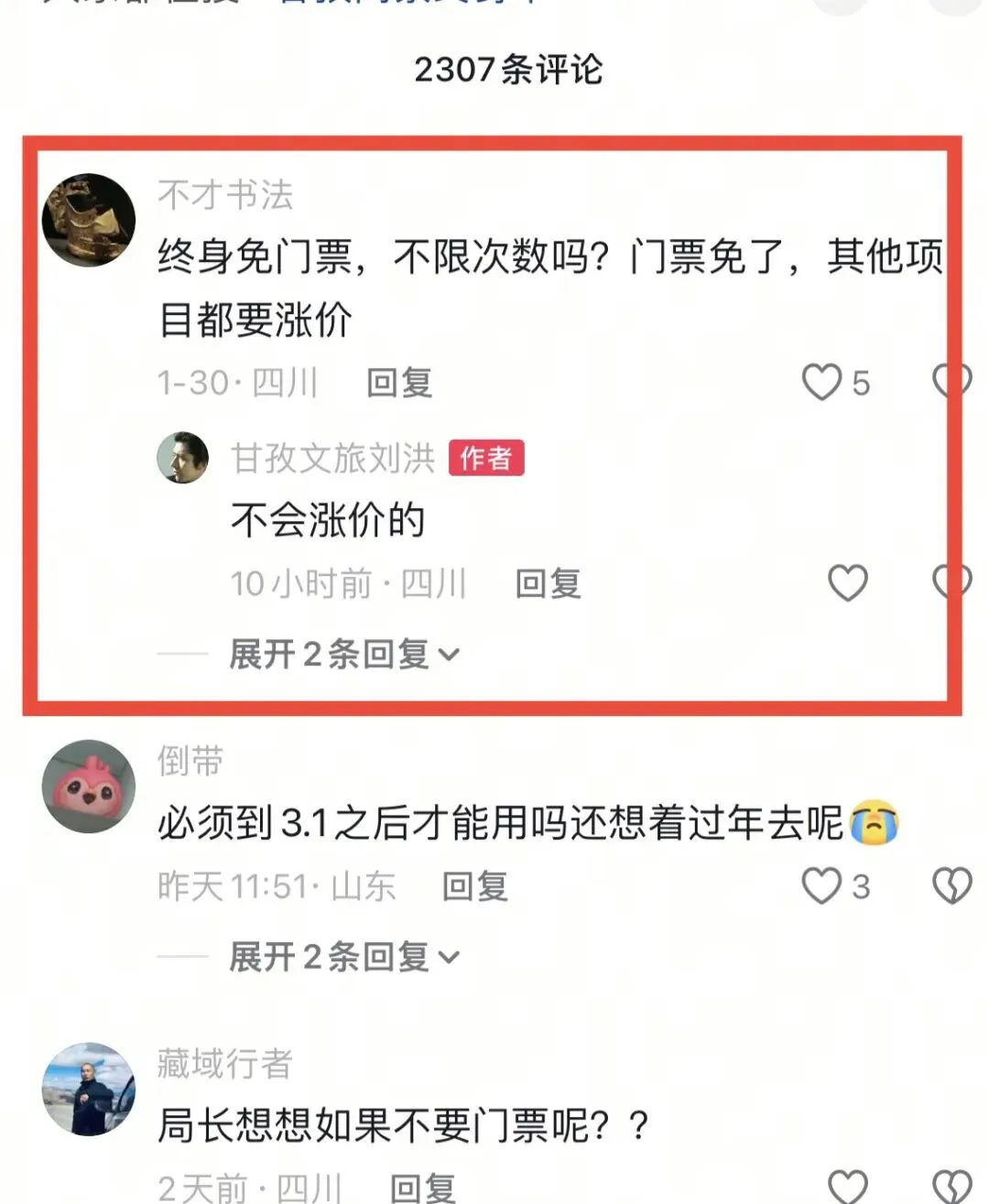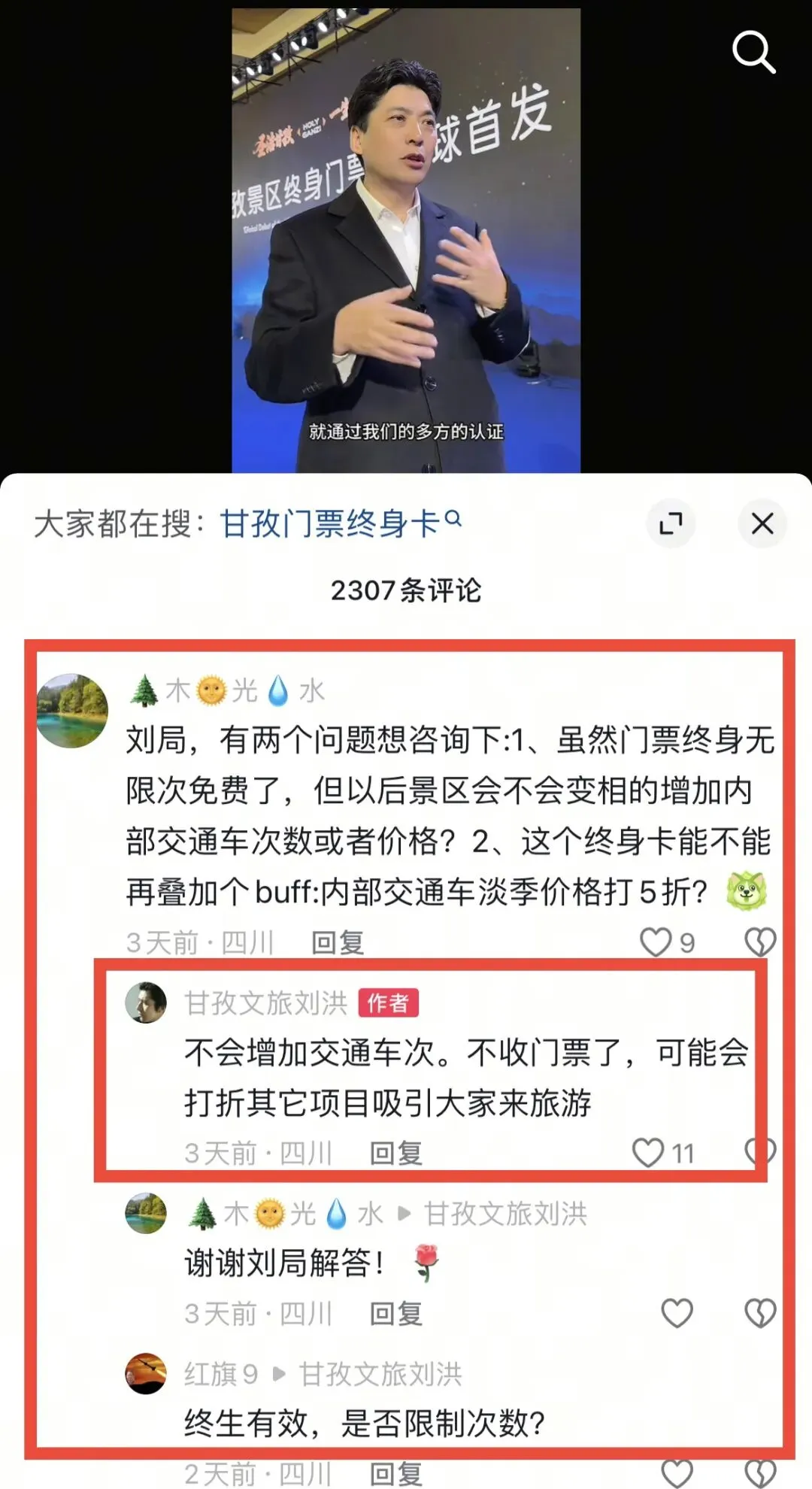 3、 刘局,有两个问题想咨询下:1、虽然门票终身无限次免费了,但以后景区会不会变相的增加内部交通车次数或者价格?2、这个终身卡能不能再叠加个buff:内部交通车淡季价格打5折?
