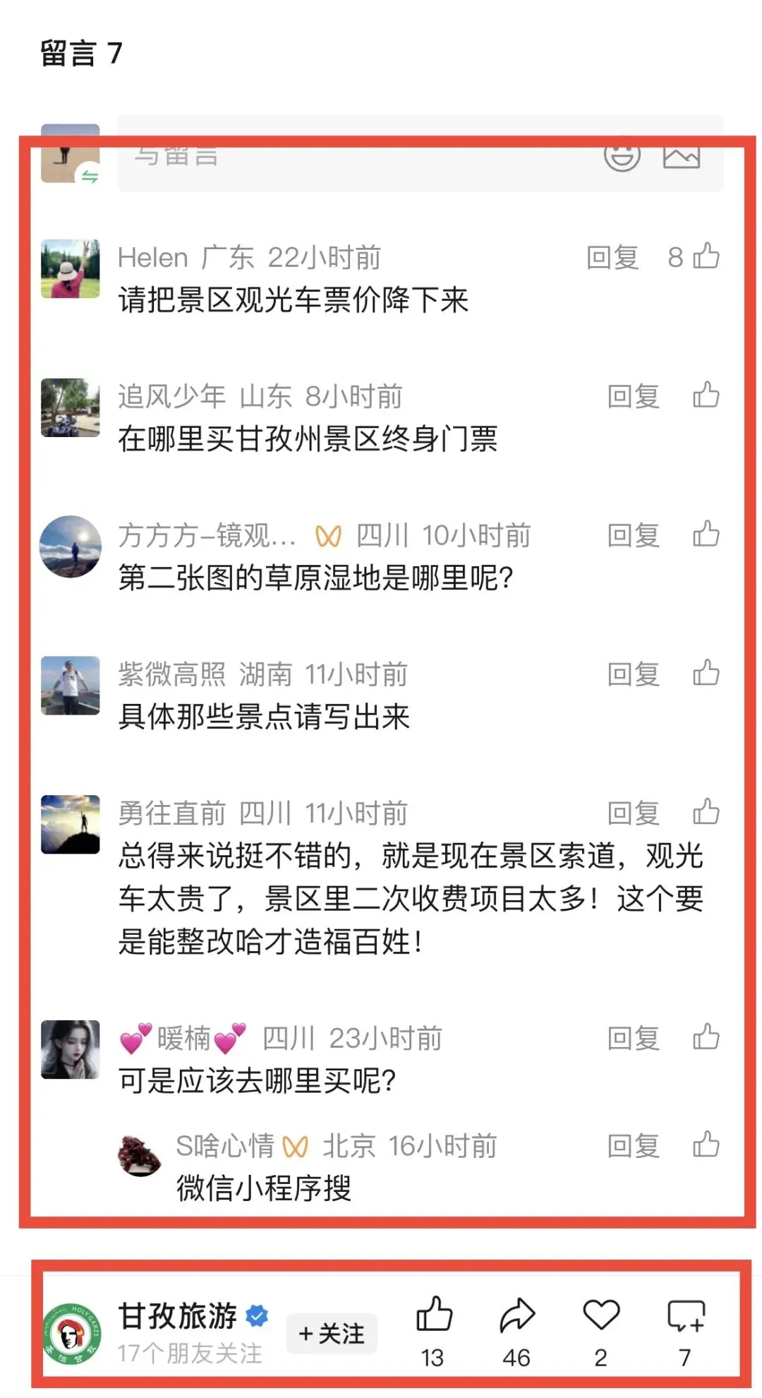 14个景区一张终身畅游门票,但是不包含交通费,然而在甘孜州文旅官方账号留言区,笔者看到,很多游客还是呼吁,现在全国自然风景区,不是门票多贵,而是景区观光车索道比门票贵,网友呼吁,甘孜州文旅考虑一下景区观光车问题,看看网友的声音,文旅局长刘洪亲自回复网友疑问。
