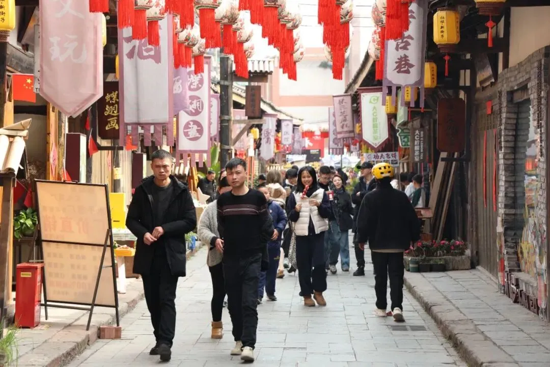 逛老街、祈福运,赏民俗、品美食,到处充满着欢乐祥和的气氛,游客踏着新年气息,携亲眷、伴朋友,满怀喜悦相聚于此,大家彼此道声祝福、畅谈新年愿望,景区充满欢声笑语。