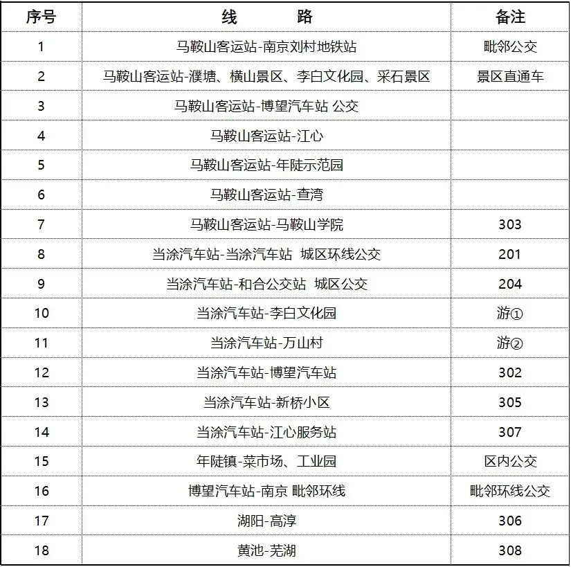 市公交集团54条线路、长运客运18条线路、科达经开A线、和县33条、含山20条、当涂县19条、博望区11条、郑蒲港新区4条,覆盖全市。具体如下: