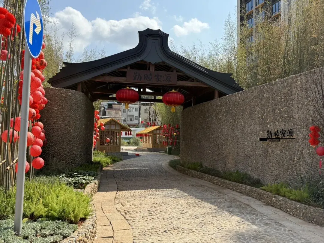 勤睦家源的大门口,入口两侧是鹅卵石垒砌的矮墙,肌理粗糙自然,与门廊的温润木质形成材质对比。墙间蜿蜒延伸着鹅卵石铺就的步道,阳光斜洒下,门廊与矮墙在路面投下清晰的光影,延伸感十足。步道两侧绿植错落,嫩绿的草本植物与修长的翠竹相映,生机盎然。 左侧竹丛间挂满串状红灯笼,右侧石墙也点缀着零星灯笼,红色元素与翠绿的草木、深褐的石墙、墨黑的屋檐形成鲜明色彩碰撞。湛蓝天空中飘着朵朵白云,光线充足,整体氛围既有着中式院落的静谧雅致,又充满了春节的喜庆祥和。