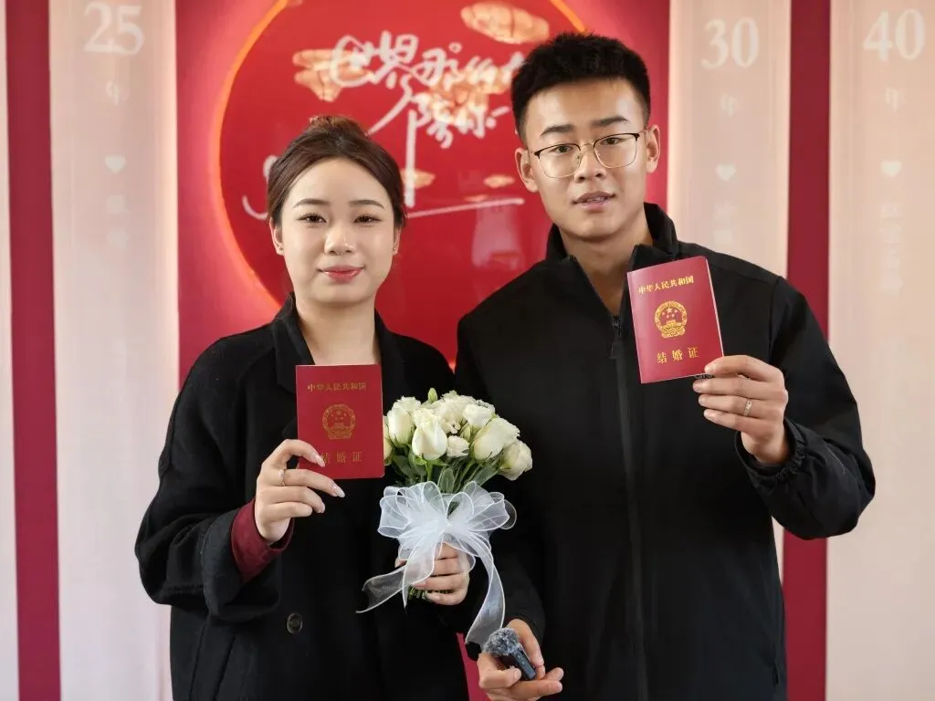在古色古香的小院里,一对对新人有序排队,在现场工作人员的指引下,递交证件、签署材料、领取“红本本”。不少新人身穿小礼服,手捧玫瑰花,在亲朋好友的见证下,印上“爱的烙印”。