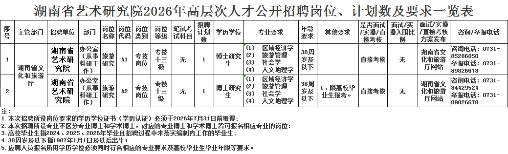 1.湖南省艺术研究院2026年高层次人才公开招聘岗位、计划数及要求一览表