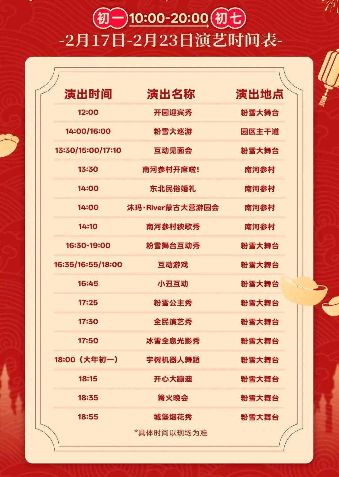2月16日:10:00—16:00,13:30“南河参村开席啦!”铁锅炖活动正常开放,无其他表演。