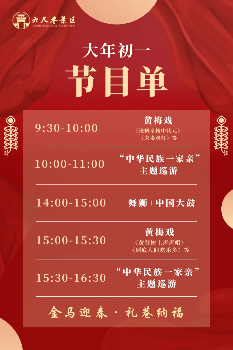 金马迎春,礼巷纳福!大年初一(2月17日),六尺巷将为您带来一场兼具传统韵味与民俗风情的新春活动。黄梅雅韵、主题巡游、狮鼓齐鸣,全天精彩不断,邀您共赴六尺巷新春之约,解锁最浓年味!