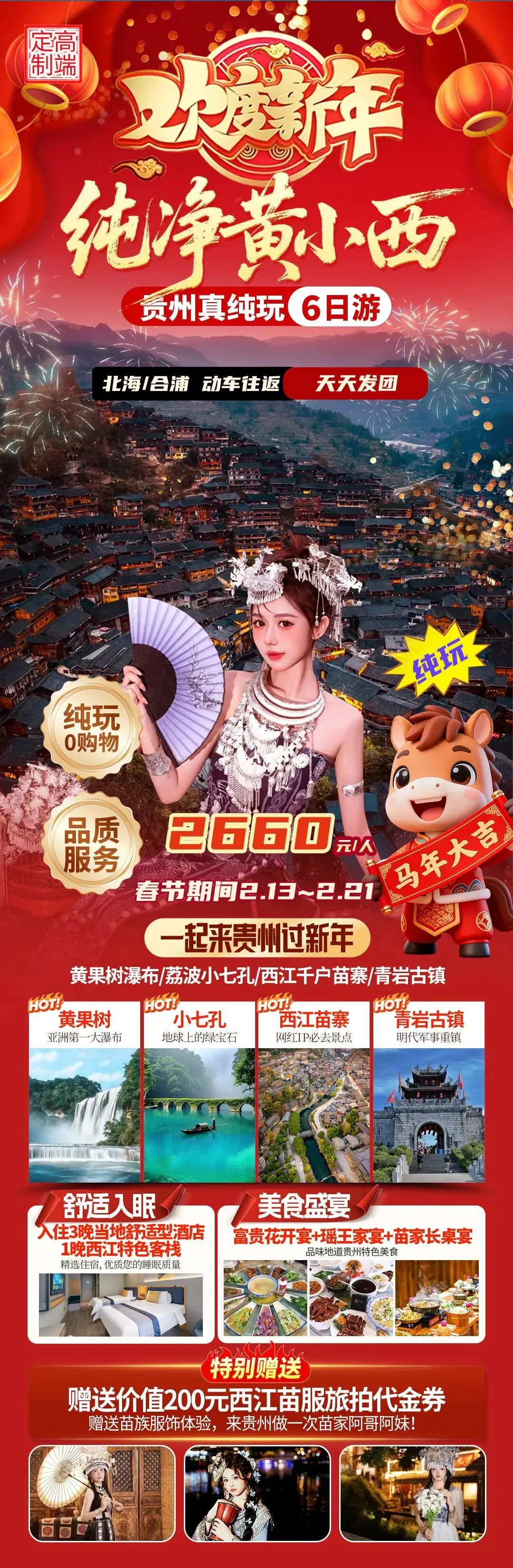 ✅ 舒心吃住体验:3 晚当地准四酒店 + 1 晚西江特色客栈,正餐含安顺富贵花开宴、瑶王家宴、西江苗家长桌宴。