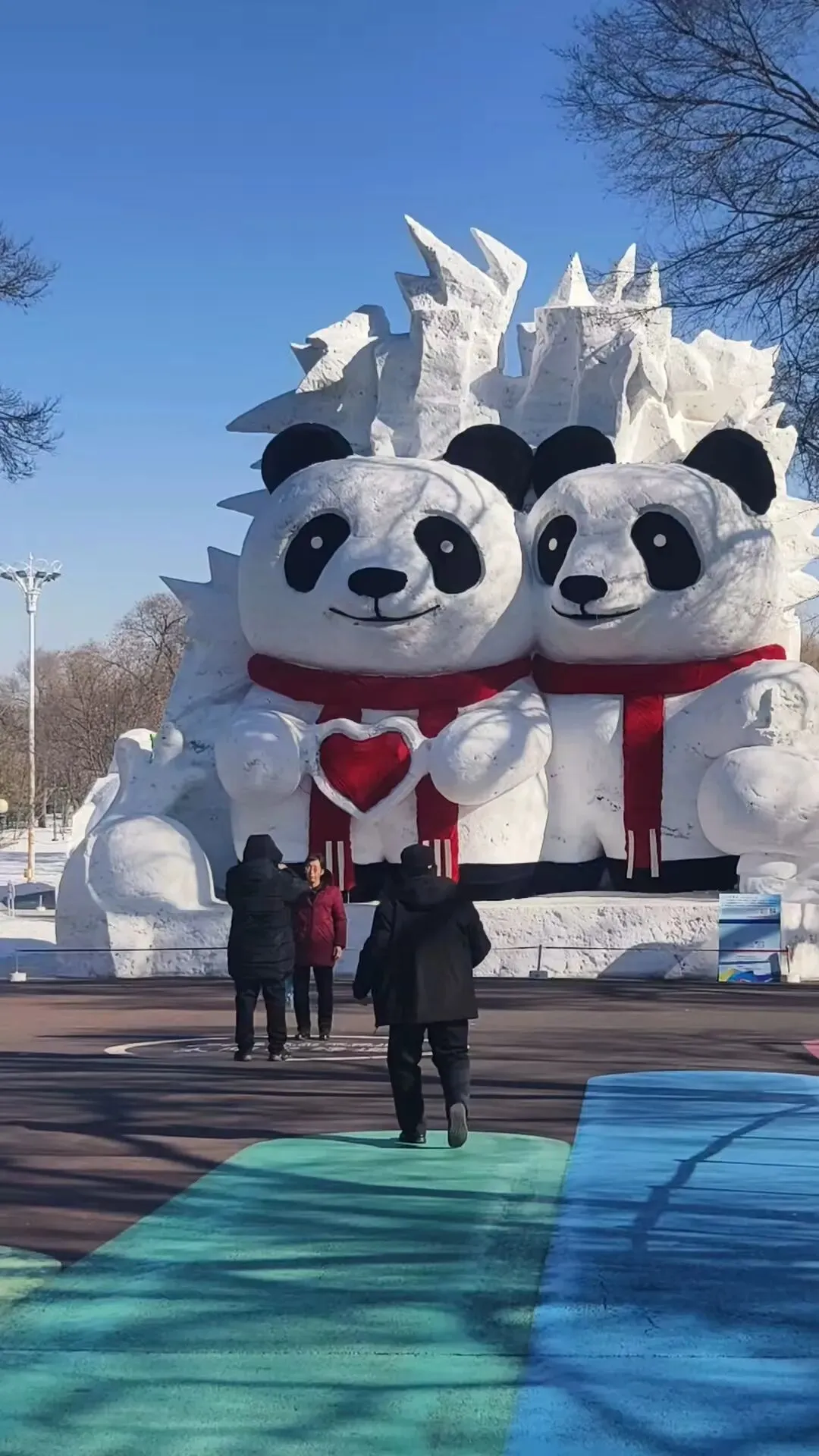 “太阳岛来客”凭借两只戴着红围巾、捧着红心的熊猫雪雕憨态可掬,成为游客们的“心头好”。来自上海的林女士正举着手机,给父母和熊猫雪雕拍合影,“我爸爸妈妈一直想来哈尔滨看冰雪,我今年特意趁着假期陪他们来旅游。我们还预约了一会去看哈尔滨的两只大熊猫,感觉这次雪博会之旅非常值得。”