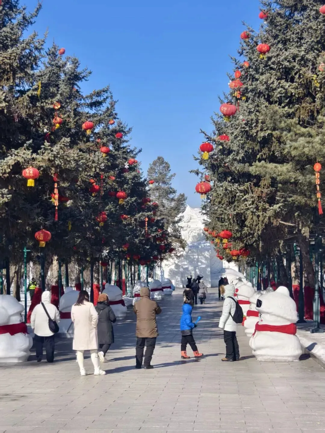 通往水阁云天的步道两侧,常青树挂满了红色灯笼,在蓝天白雪的映衬下格外喜庆。来自杭州的王女士和朋友在冰雪温度计旁驻足,“第一次见这么大的冰雪温度计,和红灯笼配在一起,年味一下子就出来了。”不少游客在造型各异的小雪人旁驻足,用镜头记录下冰城的冬日浪漫。