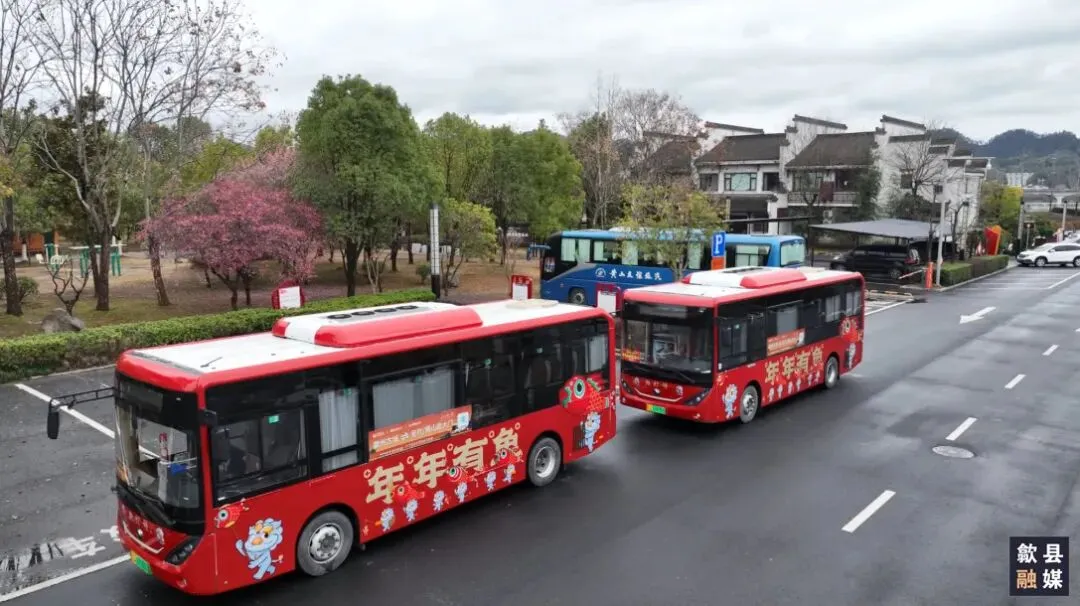 2026年春节期间,歙县交通部门量身打造的“鱼灯号”旅游巴士正式发车。该专线是为配合瞻淇鱼灯等民俗活动而开通的文旅直通车,车身通体呈喜庆红色,绘有非遗鱼灯图案,搭配“年年有鱼”字样和可爱的卡通形象,成为新春里一道亮丽的流动风景线。