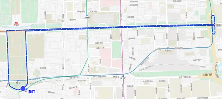 沿途设站:天坛南门、永定门东、先农坛、天坛西门(开往天坛南门方向)、天桥、珠市口南、大栅栏、前门