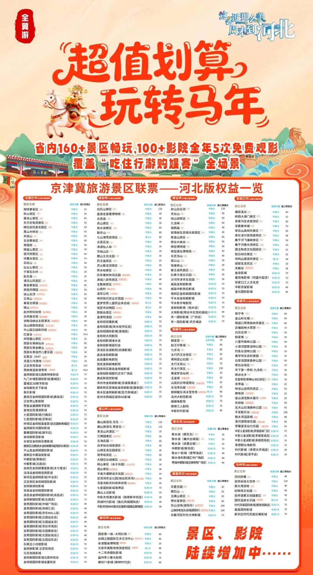 门票全免:150余家合作景区,囊括自然奇观(如白石山、野三坡)、历史名胜(如金山岭长城、清东陵、避暑山庄)、亲子乐园(如西部长青、方特东方神画)以及温泉滑雪等多元业态,满足您全年四季的出游需求。