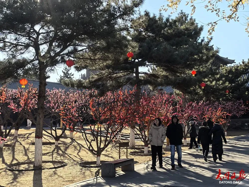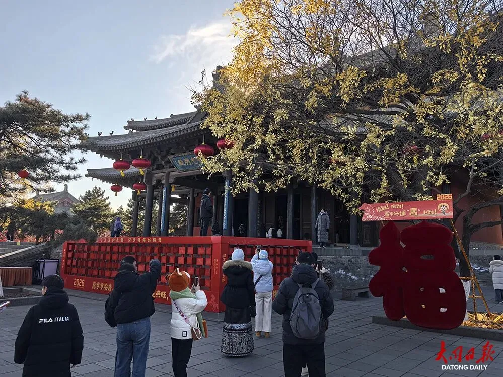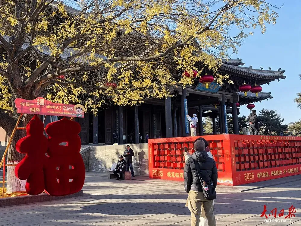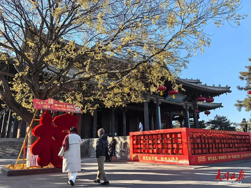 2月16日,记者来到华严寺景区采访,看到景区内游人如织,在寺院的飞檐斗栱、雕栏回廊间,一场为迎接新春而作的精致妆点,已热烈而雅致地铺陈开来。