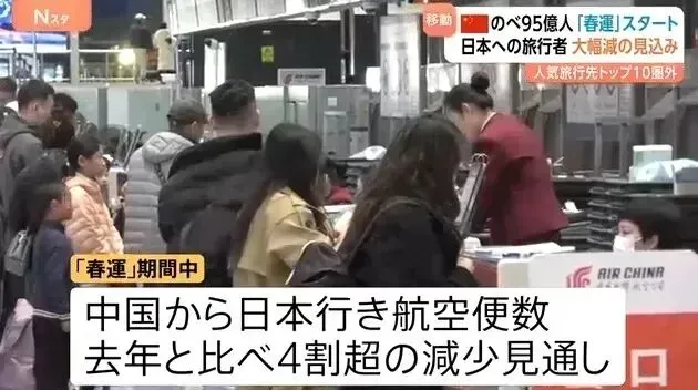 有测算显示,如果春节期间中国赴日游客数量减半,按人均消费与2025年持平计算,消费额将减少485亿日元。