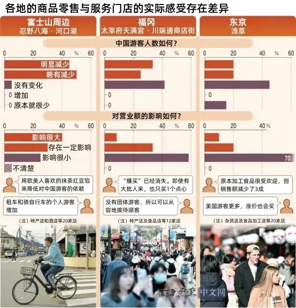 但有意思的是,日本经济新闻走访了忍野八海、福冈和浅草三个旅游景点后发现,同样是失去中国游客,各地店家的感受却大不相同。
