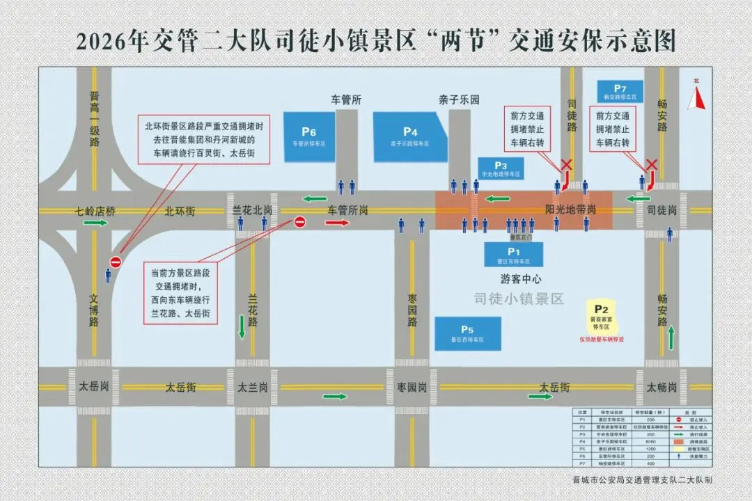 经交管部门预判,今年“两节”期间,随着“太行山上过大年”主题路线的火热,届时辖区司徒小镇景区车流、人流将有大幅度增加,可能将会造成北环街司徒小镇景区路段交通拥堵,请前往司徒小镇景区的游客根据下图将车辆驶入停车场有序停放。北环街(车管所岗﹣司徒岗)道路两侧严禁停放一切车辆,请广大交通参与者服从现场交警指挥及景区工作人员的引导。