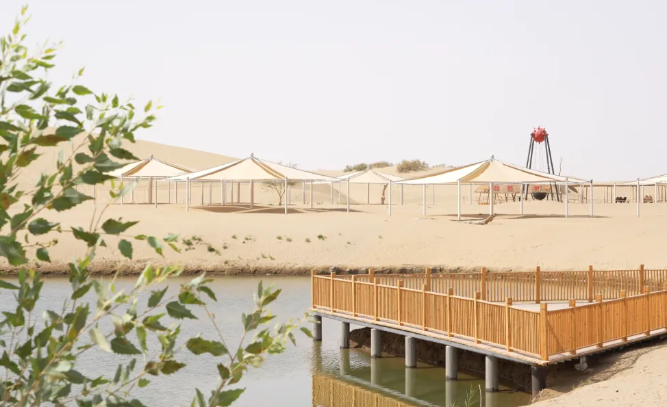 原木榫卯的塔楼登高可俯瞰沙海