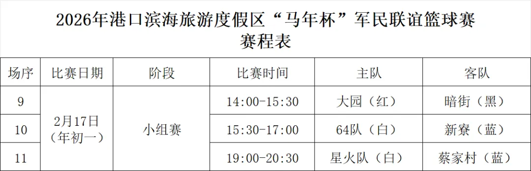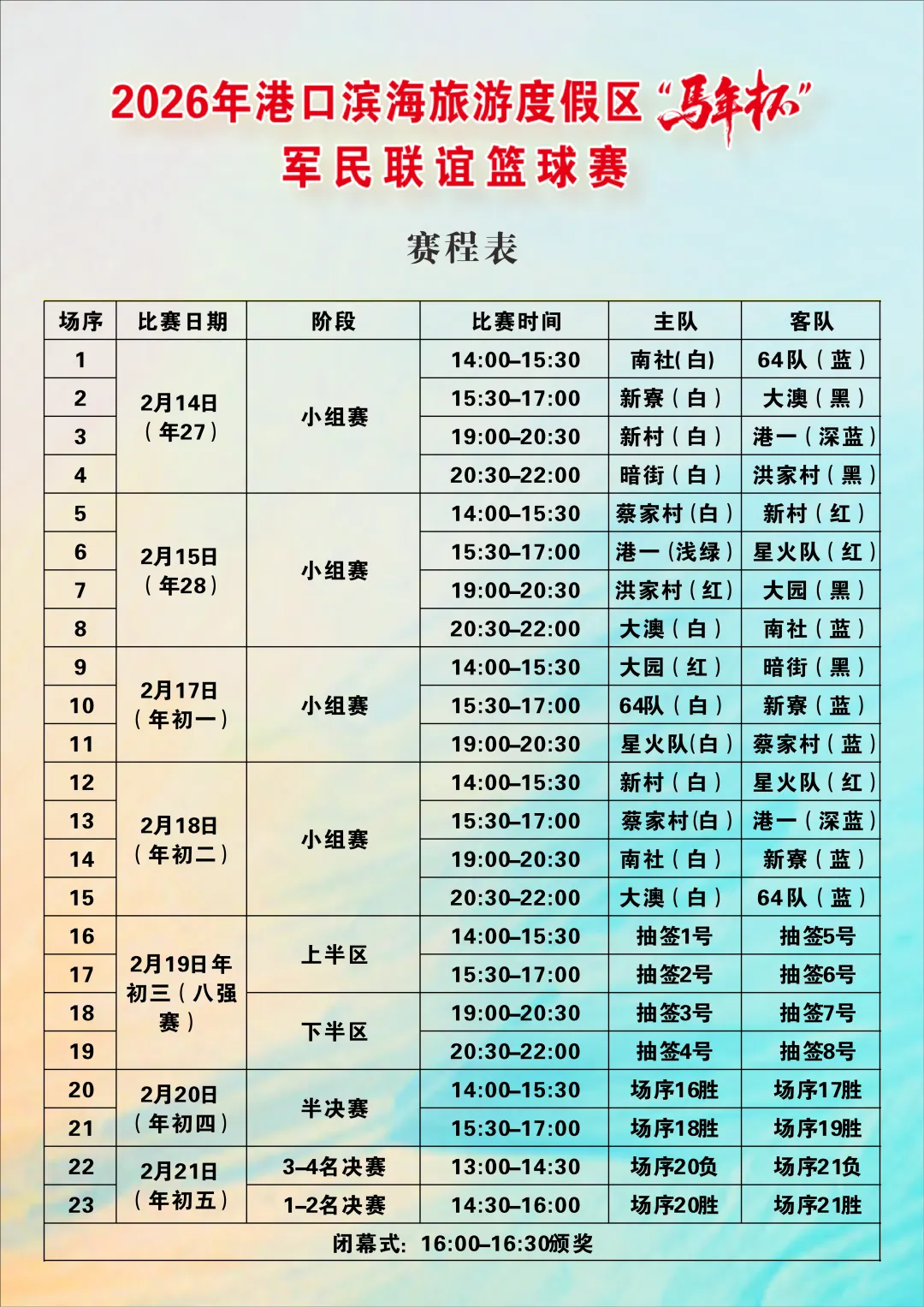 赛 程 表 2026年港口滨海旅游度假区“马年杯”军民联谊篮球赛