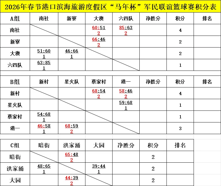 积 分 表 2026年港口滨海旅游度假区“马年杯”军民联谊篮球赛