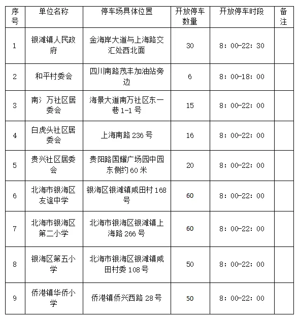 银滩景区及侨港镇附近部分机关企事业单位停车场。
