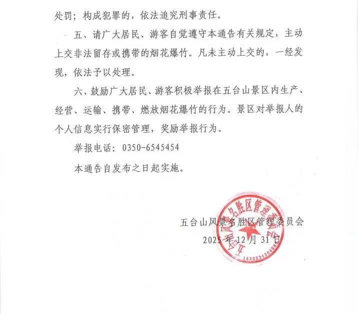 五台山风景名胜区管理委员会关于在五台山景区依法禁止生产、经营、运输、携带、燃放烟花爆竹的通告