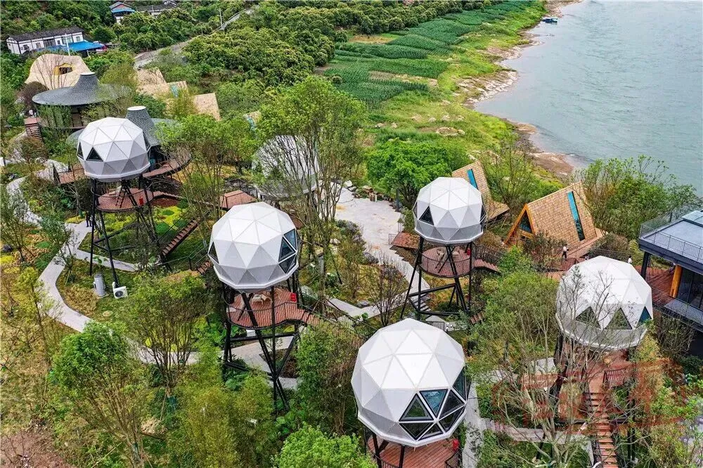 来到江北的蔗有风江畔自然营地,甘蔗立于江岸,风来时叶浪沙沙。不在山林魅力,是宋画里走出的柴门,是推窗可见的梨花。树蛙部落的穹顶屋散落在竹林与滩涂之间,当夜半听江涛与竹浪合奏,方才读懂“窥谷忘反”里的山野情趣。