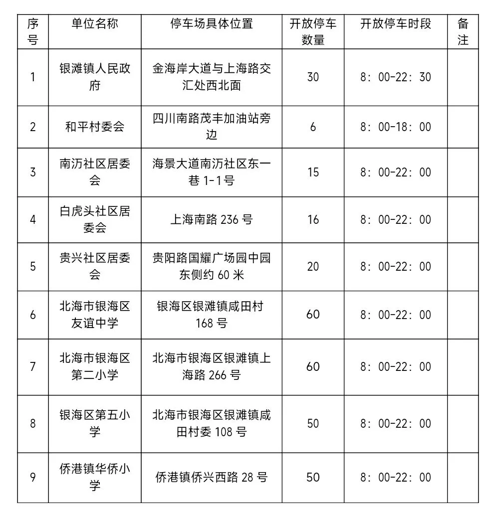 银滩景区及侨港镇附近部分机关企事业单位停车场。