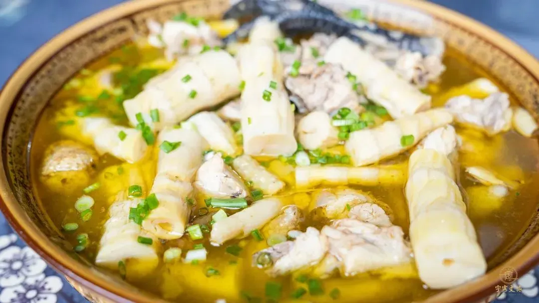 石竹笋炖土鸡:来自龙华古镇独有的高山石竹笋,与农家散养土鸡炖制而成,汤鲜味美,竹笋脆嫩爽口。