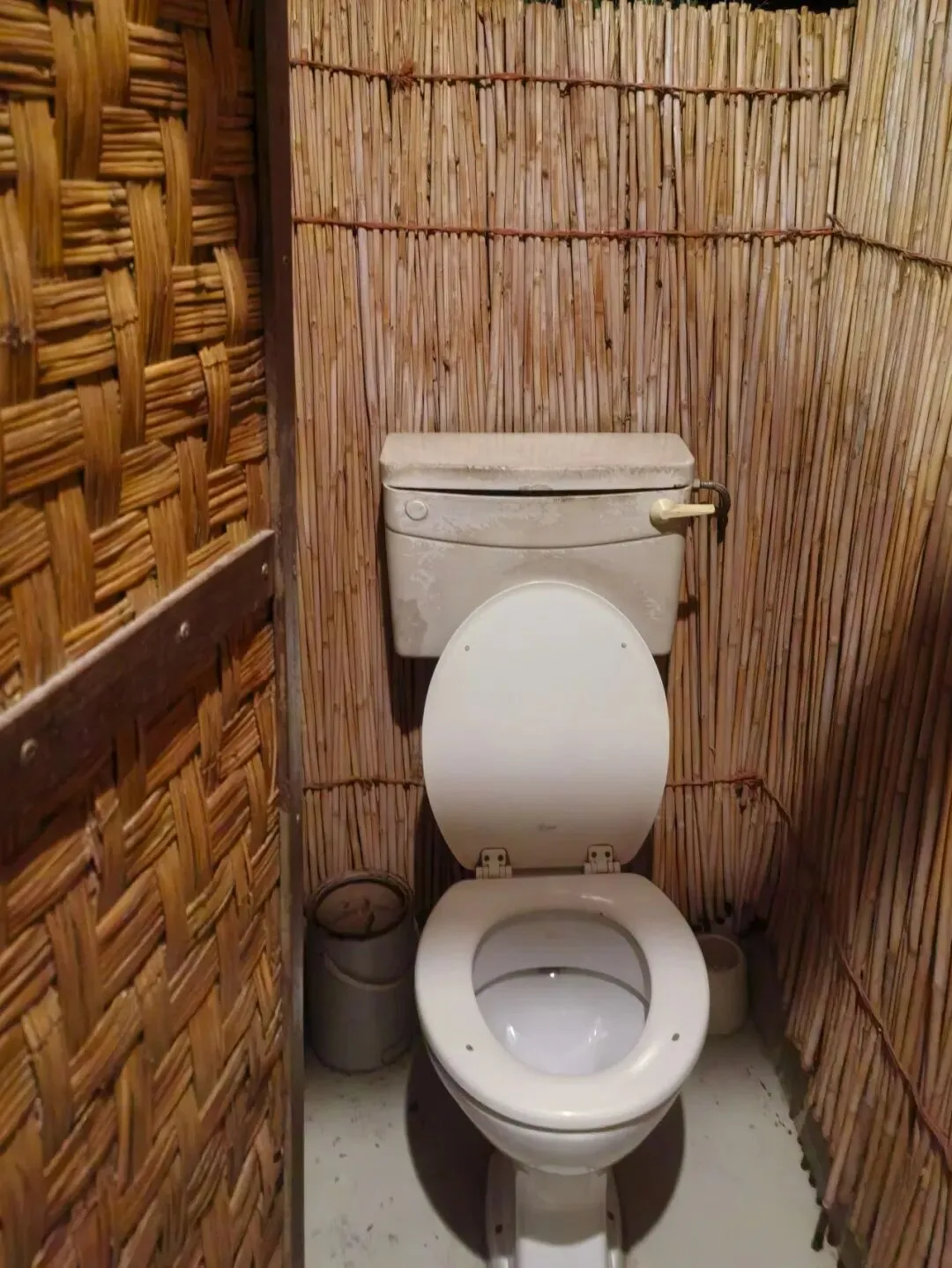 条件较差营地的马桶间比较简陋,围栏用芦苇或蒲草编织而成,密闭性较差,难免有昆虫(蜘蛛、蛾类)、蜥蜴或小型动物闯入,进入前最好先用敲敲门、跺跺脚的方式通知它们知趣地离开。进入后,先检查一下马桶,看看是否有蛇蜥类的小动物盘踞在马桶内。不过,如果你在方便时想顺便观察一下它们,也许悄悄地进去也是一种不错的选择。夜晚上厕所时,一定要戴头灯先照清楚马桶间的情况。