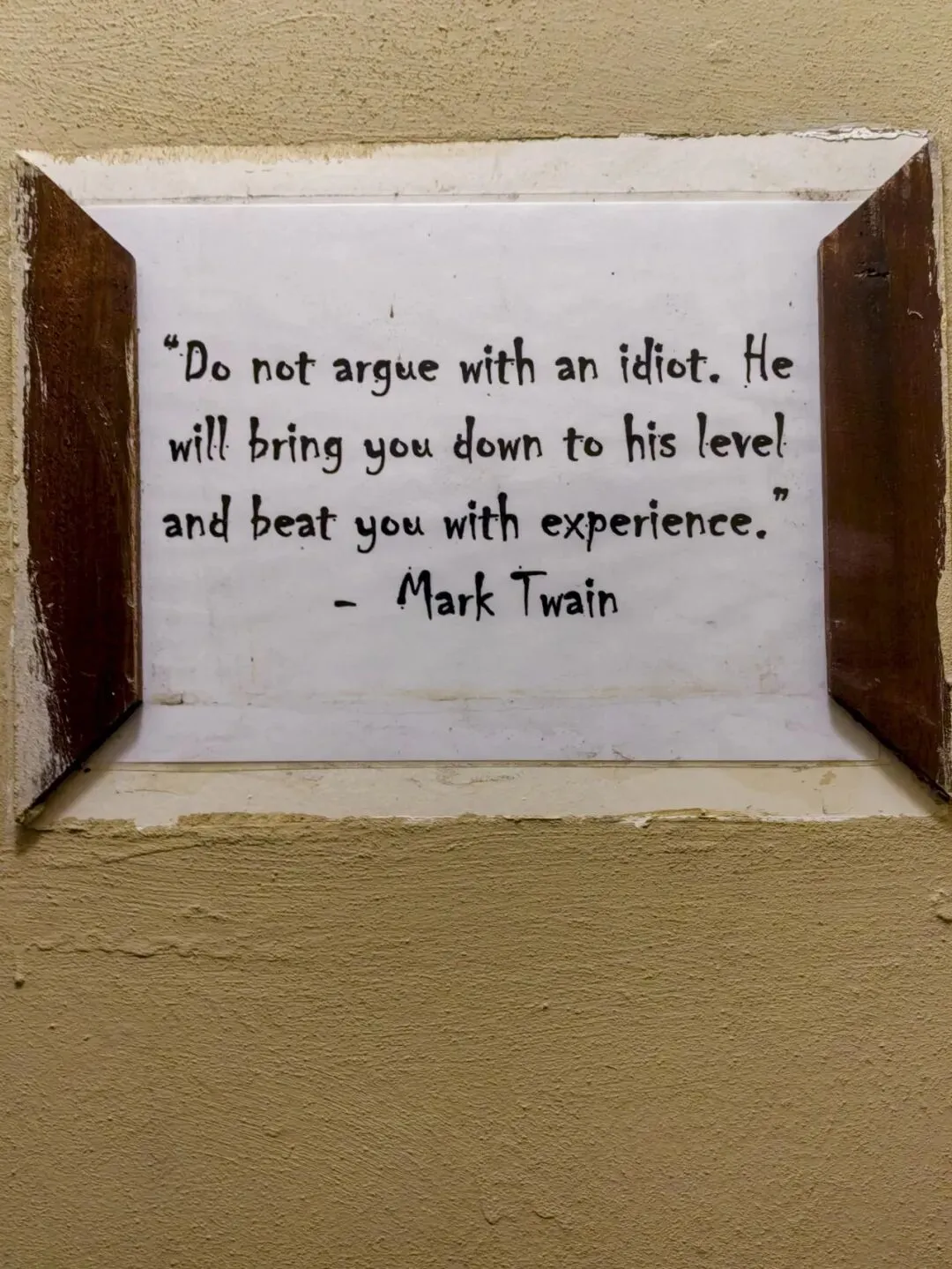 每个营地的如厕间门上都没有那种小广告和乱写乱画,倒是有些门后的小贴士还蛮有意思,比如这段摘自美国著名作家马克.吐温的书中名言:"不要和白痴争论。他会把你拉低到他的水平,然后用经验打败你。"