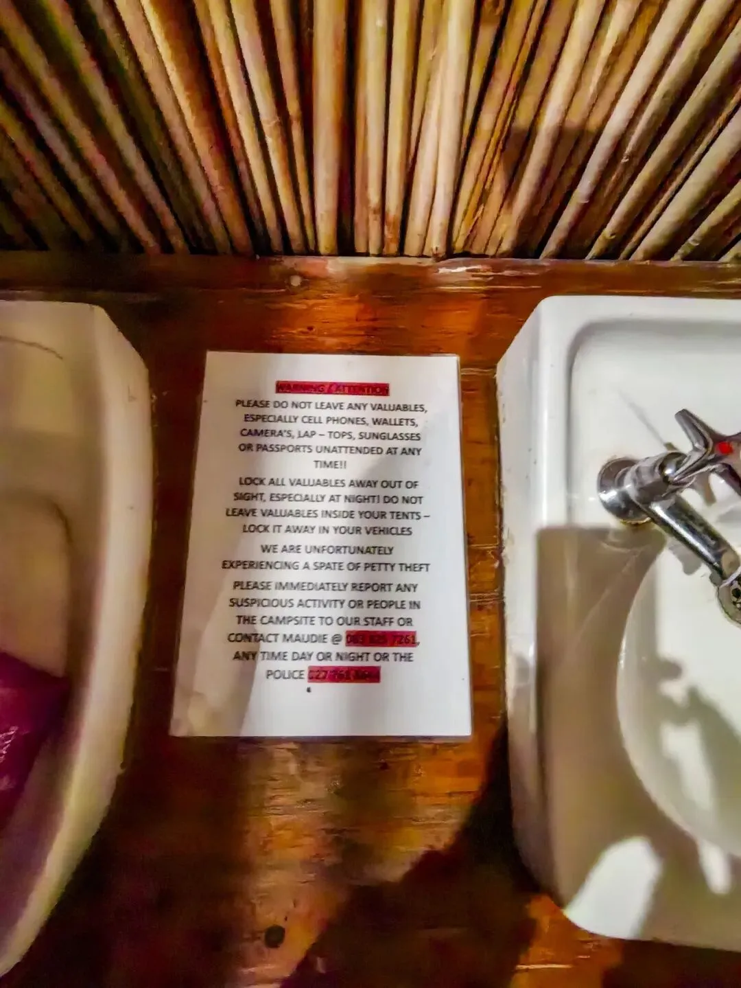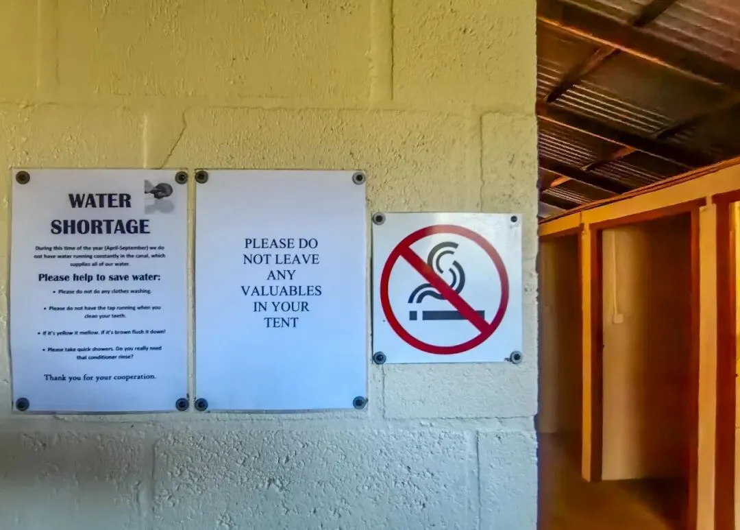每个淋浴间都有节约用水的提示,节约用水是营地规则,所有营地都珍视水资源,特别是位于沙漠中的营地淋浴间,洗浴应尽量速战速决。