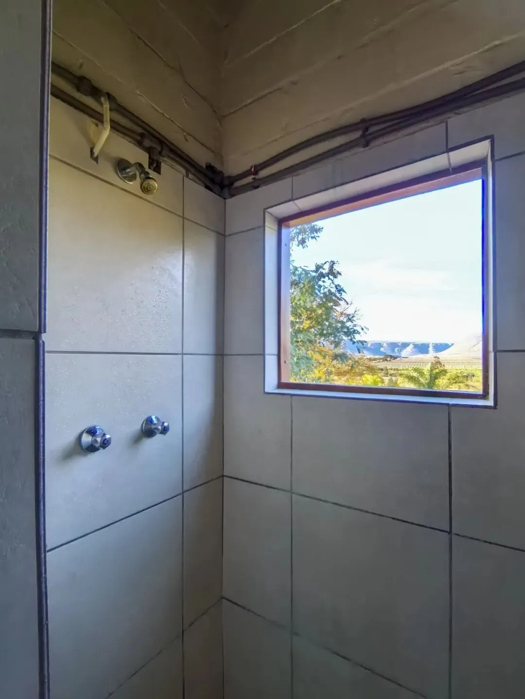 像这个淋浴间的窗口就是一幅极美的风景画,令人在淋浴时也不免心旷神怡,忍不住一遍冲洗一边想放开嗓子嚎上几句。