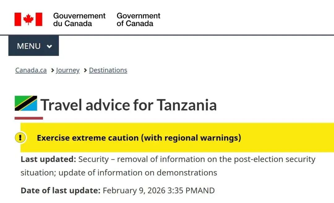 当前,加拿大全球事务部(Global Affairs Canada)的官方网站上明确建议公众在前往坦桑尼亚时要 “极度谨慎”(exercise extreme caution) ,意思是“避免一切非必要旅行”。
