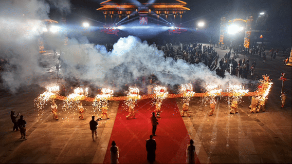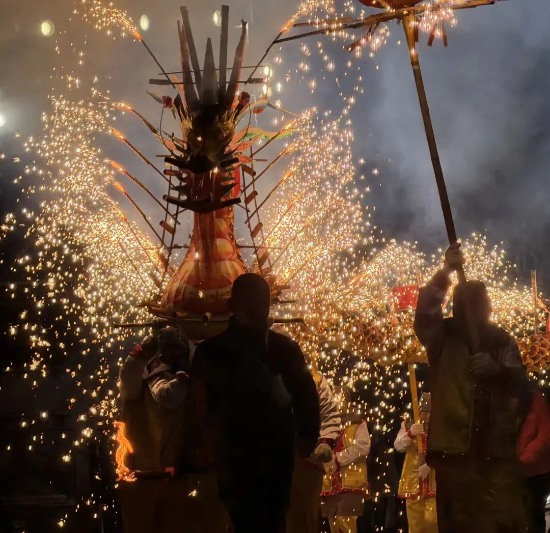 精彩的国家级非物质文化遗产——烧火龙表演隆重登场,寓意驱邪避灾、迎祥纳福,炽烈的火花划破夜空,将活动现场的氛围推向高潮。随后,迎宾烟花璀璨绽放,奉祀方阵在庄严礼乐中肃穆入场。