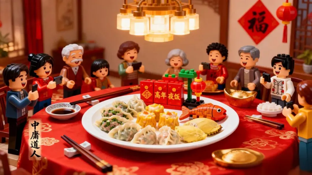 再加一个全家一起拼的“乐高年夜饭”积木放桌子中间当摆设。