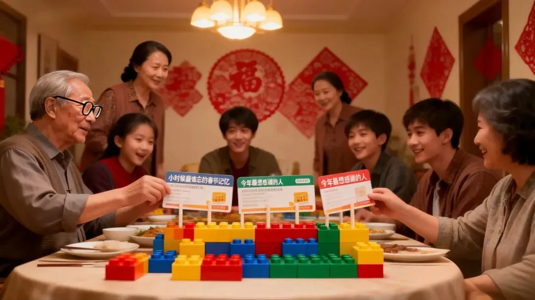 准备弄一套“年夜饭话题卡”,写在乐高积木上,拼好一个抽一个。