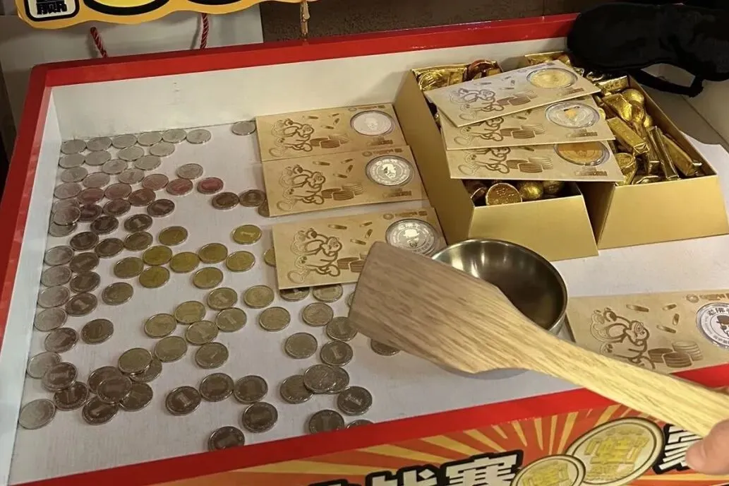 参与者蒙上双眼,原地转三圈后,凭感觉用玩具小铲挖掘道具池中的“金币”与硬币,限时一分钟,挖到一定数量的金币,可兑换惊喜小礼品或桑乐田园优惠券。