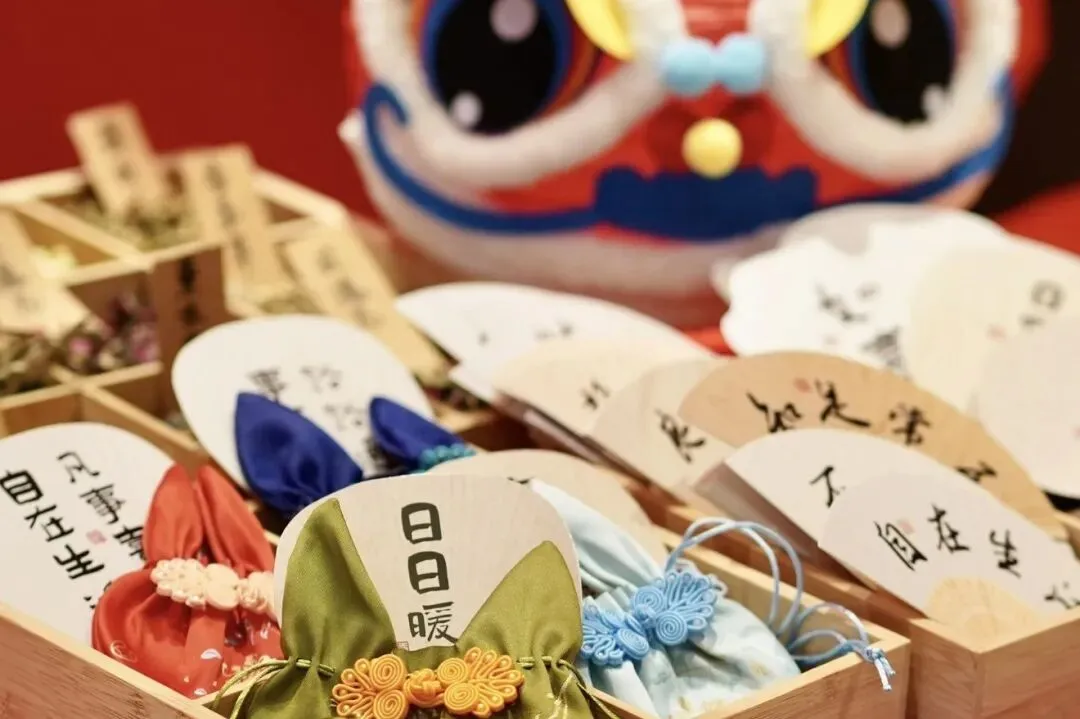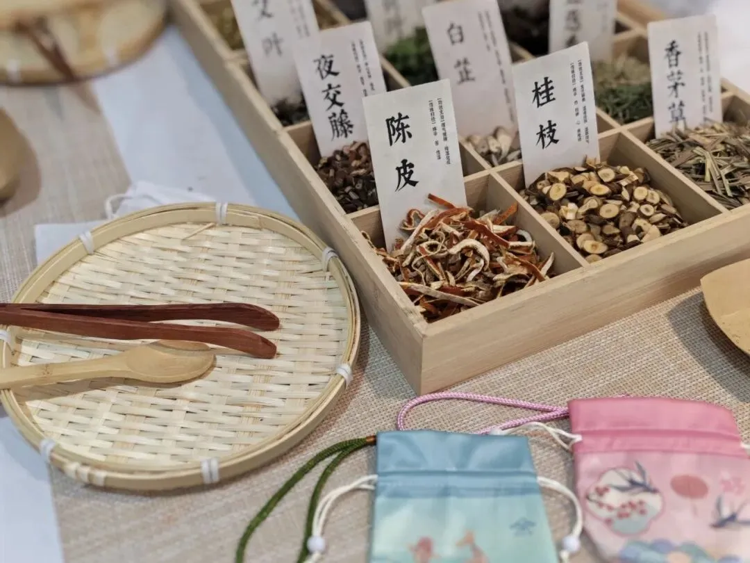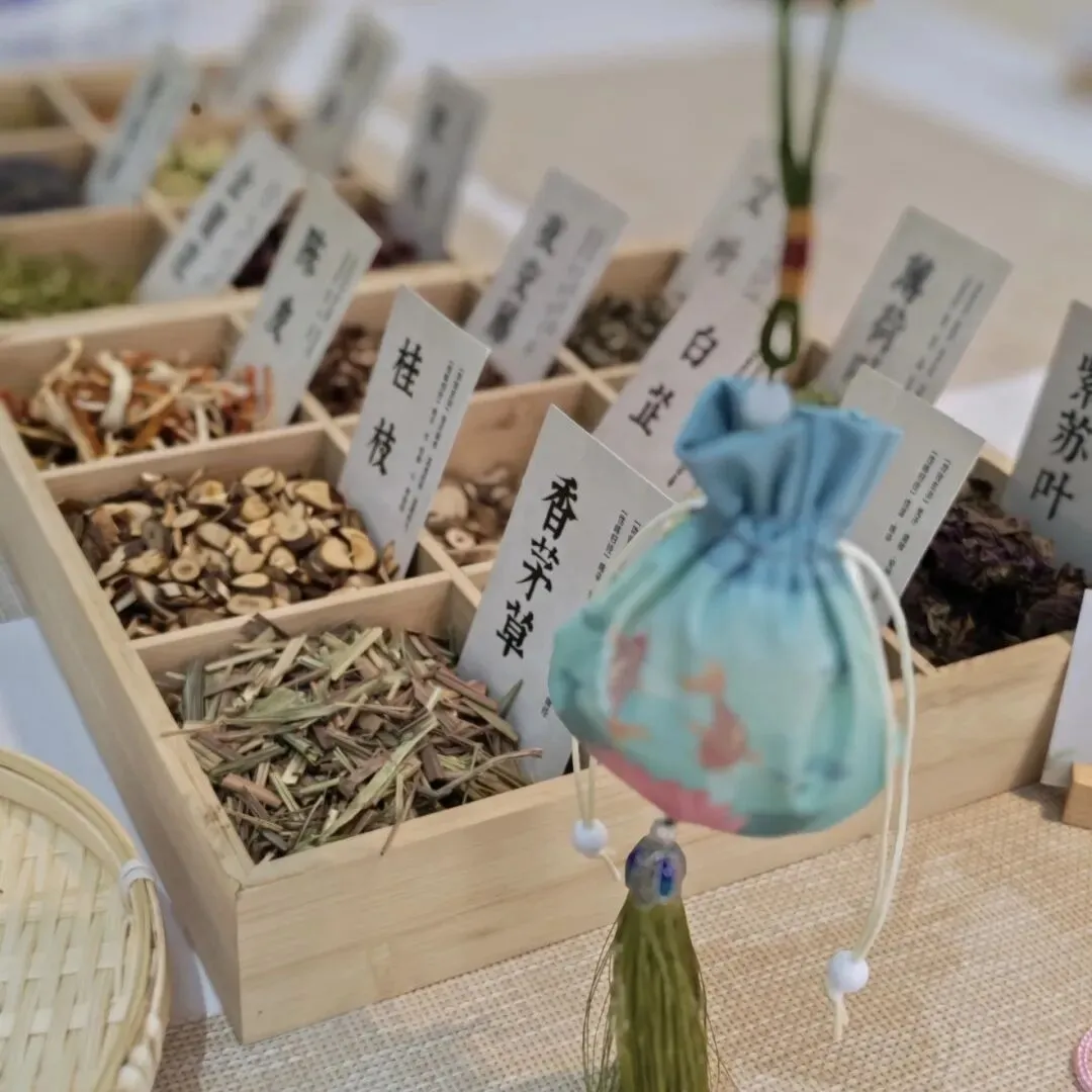 游客可自选蚕丝绸布香囊,并在香囊里填充具有安神功效的干桑叶、艾草与桂花等材料,亲手缝制并绣上祝福字样,制成可随身携带的独特新春香囊。