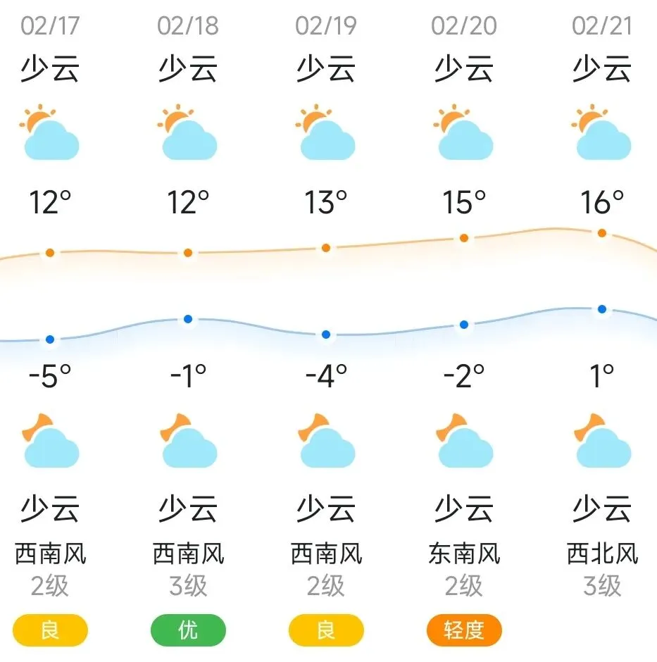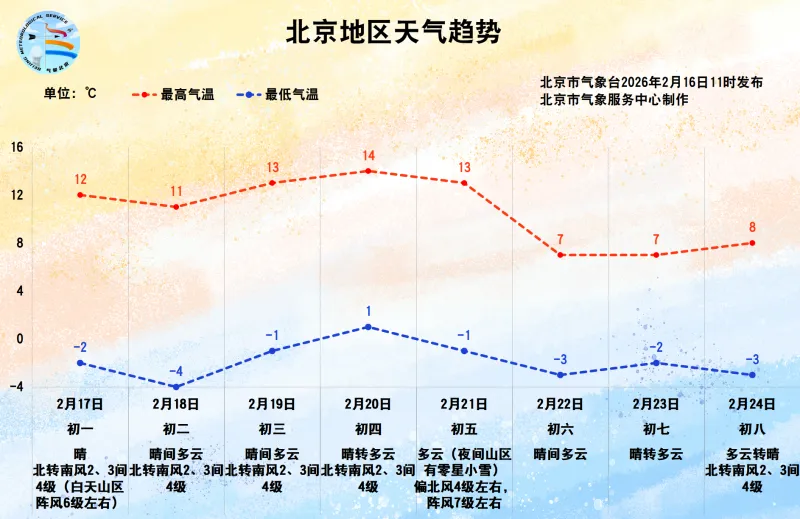 ■正月初一至初四,北京天气以晴为主,最高气温10℃以上。正月初一至初四(2月17日至20日)北京的天气仍然是以晴为主,最高气温将重回10℃以上,适宜户外活动,昼夜温差大,大家早晚外出还需注意保暖。受冷空气影响,初五(21日)北风加大,阵风7级左右,初六、初七风力减弱但气温将再度下降。请关注临近预报,注意防风防寒。