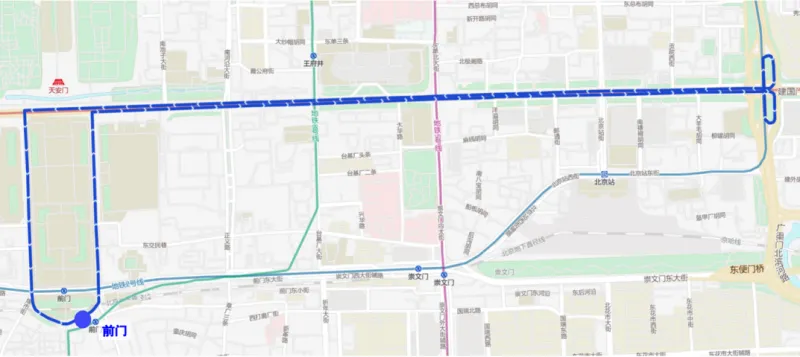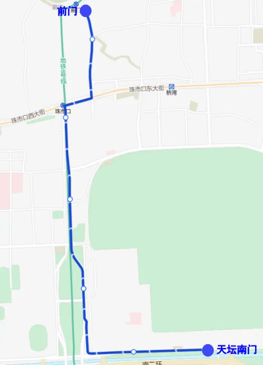 沿途设站:天坛南门、永定门东、先农坛、天坛西门(开往天坛南门方向)、天桥、珠市口南、大栅栏、前门