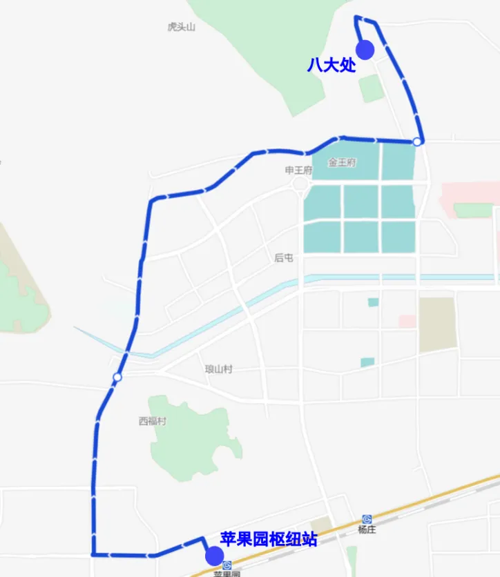 沿途设站:苹果园枢纽站、模式口东里、八大处南站(开往八大处方向)、实兴北街北口(开往苹果园枢纽站方向)、八大处
