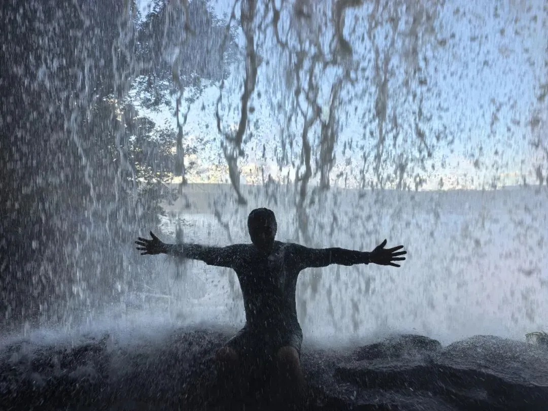 下船走近最后一股瀑布,只见一道巨大的水帘垂挂眼前。向导示范让大家穿越水帘。阿木有点犹豫,主要是怕淋湿了会冷。但既然来了,哪有不试的道理?他硬着头皮钻进水帘,进入了瀑布背后的洞中。这一下,身上已经湿了七分。