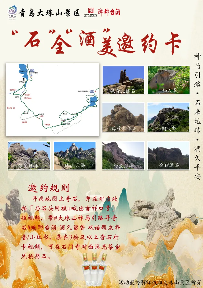 石全酒美邀约卡。跟随线路指引,开启你的奇石发现之旅!在检票处领取“任务卡”,进山去寻找奇并按照要求发布打卡视频,就有一份精美礼品等着你。
