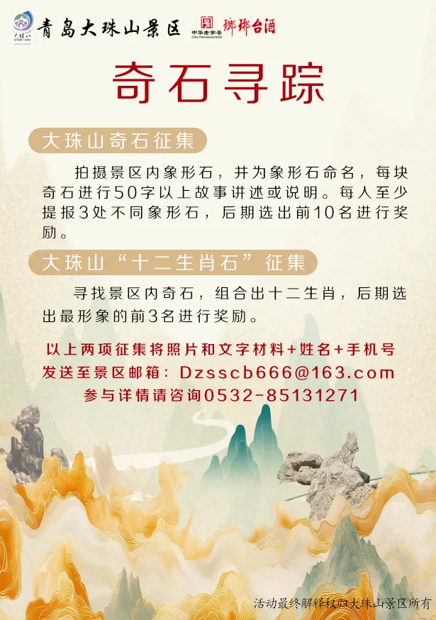 奇石寻踪、十二生肖石全民征集。如果你在山里发现了象形石、长得像生肖的奇石,拍照上传到景区官方平台,一旦认定命名,你就是这块石头的“发现者”,还能拿到丰厚奖励。