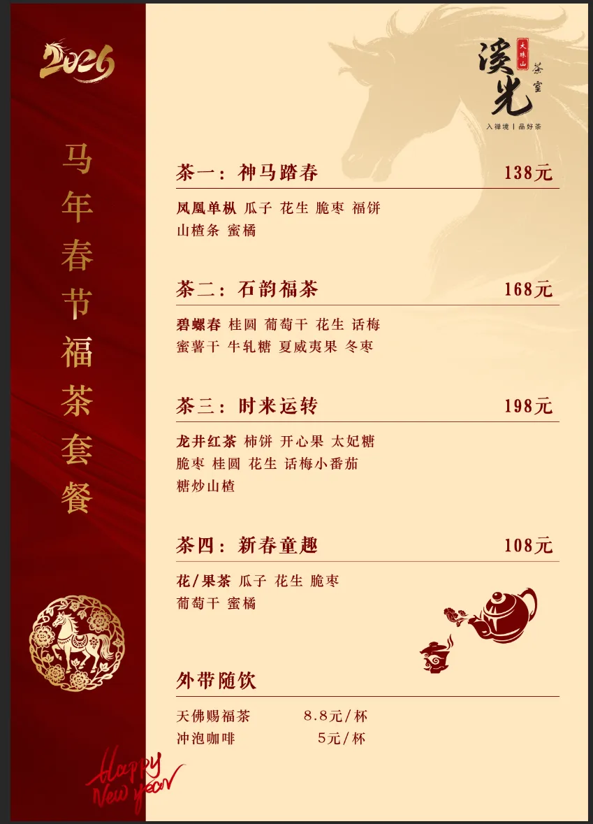 溪光茶室·马年福茶。逛累了可以到半山的溪光茶室坐一坐,今年春节限定推出的“福茶套餐”,有绿茶红茶和果茶,可以满足一家人的需求,点上一套福茶,还能免费领一条祈福带。