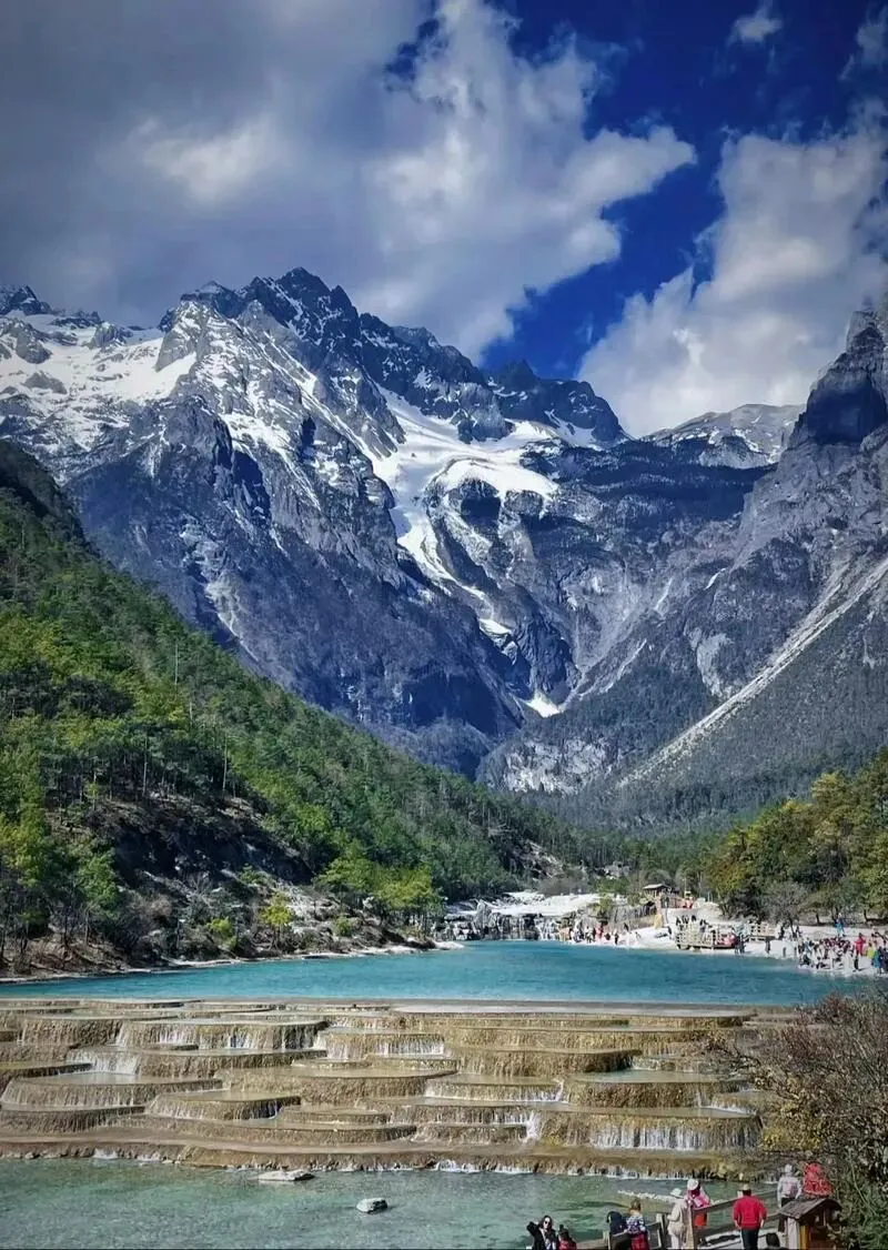 5.蓝月谷:蓝月谷风景区是位于云南省丽江市玉龙县玉龙雪山东麓的景区,景点有玉液湖、镜潭湖、蓝月湖和听涛湖。蓝月谷是丽江玉龙雪山冰川的万古冰雪消融之后顺着峭壁流淌而下,不断汇集为山涧、溪流,最终在上游深谷之中形成了清澈见底、甘冽无比的河流。玉龙雪山管委会于2006年投资开发了蓝月谷景点,建设6个景观拦砂坝。