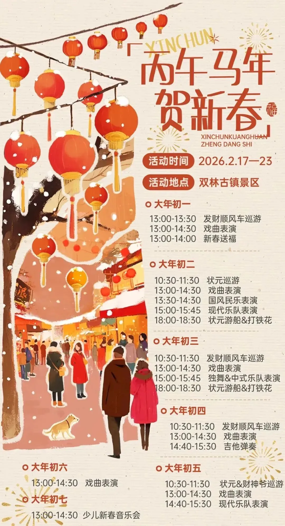 在新春里,双林古镇新春活动精彩不停!状元与财神巡游送福,每日有戏曲表演,初二、初三夜间可赏打铁花。还有民乐、乐队演出、非遗手作等活动,年味集市热闹非凡,满满江南烟火气。