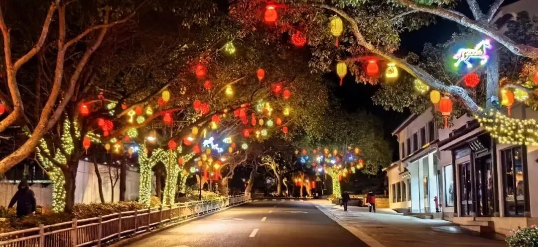 在普陀山正山门广场,历史情景剧在此上演,可以偶遇古人NPC;朱家尖四大景点披上了红火的马年新春盛装,快来此进行合影吧;马路上还挂起了红灯笼,年味拉满了!