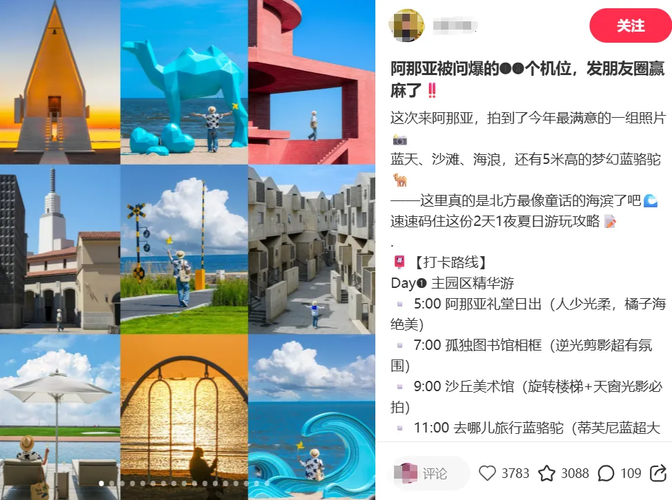 追求出片的双面效应 出片文化对景区的影响是复杂的,既有积极一面,也有负面效应。积极效应:出片能带来流量与关注。以阿那亚为例,一座孤独图书馆的“出片效应”,让一个濒临烂尾的项目重获新生。在流量为王的时代,一个高辨识度的打卡点,往往能成为景区复苏的引爆点。负面效应:但更多时候,出片文化正在侵蚀旅游的本质体验。一是公共空间被“霸占”,拍照者长时间占据最佳观景位置,普通游客被迫等待或绕行。二是景区同质化严重,相似的打卡道具、雷同的标语、滤镜过度的照片,让景区失去独特性与在地性。三是体验深度被压缩,旅行沦为“拍照—修图—发圈”的流水线,游客与景区的真实互动被弱化。